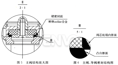 (3)主閥、導(dǎo)閥閥芯閥座采用硬軟雙質(zhì)密封副。如圖6所示,閥芯底端內(nèi)錐面與閥座凸臺(tái)錐面組成硬密封副,硬密封面堆焊stellite合金,并配對(duì)研磨,耐蝕、耐腐、耐沖刷,閥芯內(nèi)腔硫化氟橡膠與閥座錐面凸臺(tái)端面組成軟密封副。閥芯底端嵌的軟密封墊,設(shè)計(jì)受力條件三相應(yīng)力,滿足高壓力密封條件,底端內(nèi)錐硬密封面,也是定位面,使軟密封材料始終在彈性范圍內(nèi)工作。硬軟雙質(zhì)密封副保證了氣體介質(zhì)密封可靠,實(shí)現(xiàn)了安全閥回座密封“零泄漏”。使安全閥回座密封零泄漏這一長期存在的技術(shù)難點(diǎn)得到解決,通過靜壓試驗(yàn)該閥啟閉1500次以上仍保證