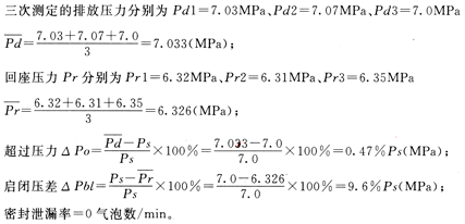 該閥型式試驗(yàn)送機(jī)械工業(yè)通用機(jī)械產(chǎn)品檢測所測試,編號(hào)NO:2004FM450。整定壓力Ps=7.0MPa,按標(biāo)準(zhǔn)排放壓力Pd應(yīng)≤7.7MPa,回座壓力應(yīng)≥5.95MPa。
