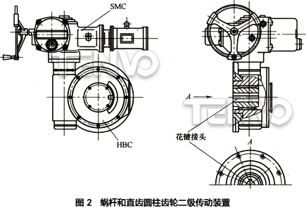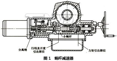 2)機(jī)械減速器:閥門用機(jī)械減速器裝置的選擇應(yīng)該根據(jù)力矩的大小、傳動(dòng)比、效率和外形尺寸來考慮。一般有以下幾類:①蝸桿傳動(dòng)一采用蝸輪、蝸桿來減速,如圖1所示。從圖中可以看出電動(dòng)機(jī)用離合器帶動(dòng)蝸桿,并由蝸桿傳動(dòng)蝸輪,將力矩輸出至閥桿螺母。當(dāng)需要手動(dòng)時(shí),可將拉桿向右拉,使蝸桿上的離合器與電動(dòng)機(jī)離合器脫開,實(shí)現(xiàn)手動(dòng)、電動(dòng)的轉(zhuǎn)換,蝸桿減速裝置比較簡(jiǎn)單,制造容易,適用于傳動(dòng)比i=20~60,一般使用在