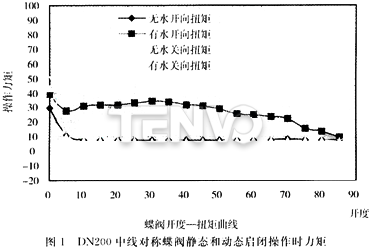 蝶閥安裝在管道上,有流動(dòng)介質(zhì)時(shí),蝶板受到介質(zhì)偏心力矩的作用,蝶閥的操作力矩與靜態(tài)時(shí)不同,在某些開度會(huì)變大或減小。我們進(jìn)行DN50~DN300系列中線對(duì)稱蝶閥動(dòng)態(tài)啟閉操作時(shí)力矩檢測,結(jié)果表明,閥門尺寸越大.,變化值越明顯。其中DN200、DN300中線對(duì)稱蝶閥動(dòng)態(tài)啟閉操作時(shí)力矩值見表3、表4。靜態(tài)壓力和動(dòng)態(tài)流量下的中線對(duì)稱蝶閥啟閉操作時(shí)力矩曲線見圖1、圖2。