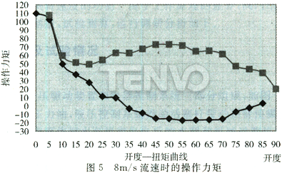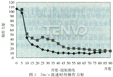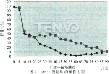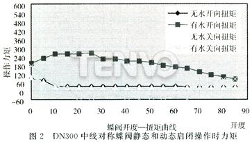 從表3的數(shù)據(jù)和圖1的曲線看,DN200的蝶閥各開度位置的操作力矩未超過蝶閥啟閉時(shí)刻的最大轉(zhuǎn)矩;從表4的數(shù)據(jù)和2的曲線看,DN300的蝶閥某些開度位置的操作力矩未超過蝶閥啟閉時(shí)刻的最大轉(zhuǎn)矩。