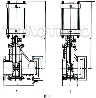 (1)當垂直安裝時耐磨干灰閘閥出口短節(jié)底部開有一個排灰槽(如圖1B所示)閥門的上密封外設計有兩個透式孔。閥體底部設計了可拆卸的透式孔,當閥體底腔內(nèi)積聚到一定程度時,打開所有透式蓋,只要定期清理,就可解決閥腔內(nèi)積灰的問題。