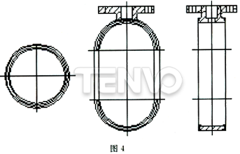 閥體是閥門的主要部件,其密封槽加工質量的好壞將直接影響閥門的整體質量,過去的加工方法不合理,密封槽加工不規(guī)則,圓弧段與直段接口處有錯口現(xiàn)象,焊后成形很不美觀。其原工藝方法:先卷制圓環(huán)(如圖4)平兩端面及車兩端密封槽尺寸,深度比設計尺寸大1mm,之后從圓環(huán)中間鋸開并與側腹板焊接,再上銑床銑直密封槽尺寸。