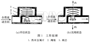 該閥屬于熱靜力型蒸汽疏水閥,是依賴于熱雙金屬片的受熱變形產(chǎn)生的熱推力工作的,即是利用熱雙金屬元件的熱敏特性,依靠介質(zhì)的溫度變化使熱雙金屬元件產(chǎn)生彎鹽從而產(chǎn)生熱推力,該力與介質(zhì)對閥芯作用力的方向相反,利用其差值的大小來控制密封元件的開啟和關(guān)閉,實現(xiàn)自動排水阻汽的目的。其工作原理如圖1所示。
