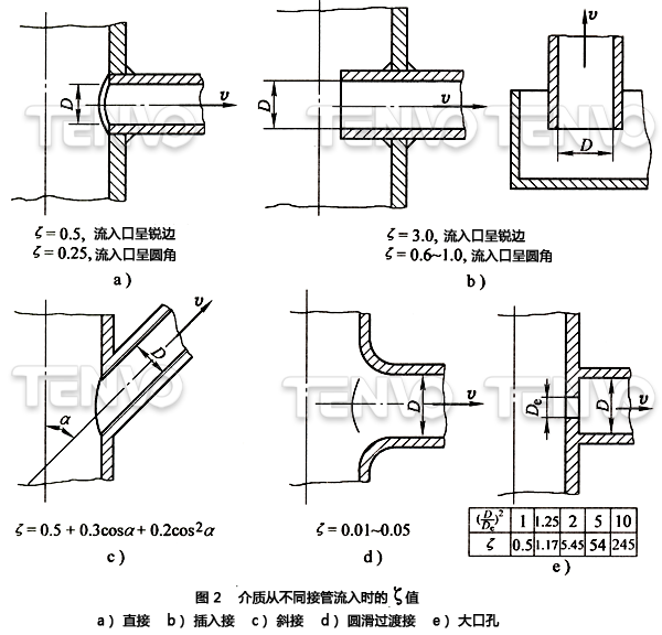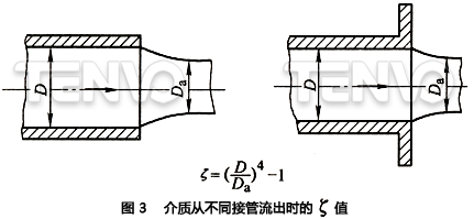 (1)導(dǎo)管的流人和流出當(dāng)容器與導(dǎo)管連接的時(shí)候,導(dǎo)管被安裝在容器的出口或入口上,或者把導(dǎo)管的一頭插入罐內(nèi)引出導(dǎo)管,見(jiàn)圖2和圖3。圖中已給出各種情況下的ζ值。