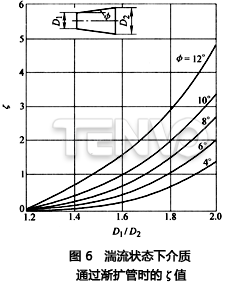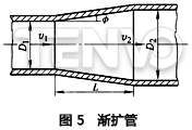 2)漸擴(kuò)管。圖5為介質(zhì)通過(guò)漸擴(kuò)管的簡(jiǎn)圖。壓力損失產(chǎn)生于介質(zhì)對(duì)管壁的摩擦和流線的擴(kuò)大。△p是幾何尺寸Dl、D2、L和Φ的函數(shù)。