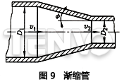 4)漸縮管。如圖9所示的漸縮管,其壓力損失比突然收縮的要小,其壓力損失△p的計(jì)算如下: