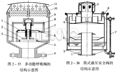 (6)筒式液壓安全閥。圖2-38是筒式液壓安全閥的結(jié)構(gòu)示意圖。它由儲液槽、懸起式隔板、安全閥罩蓋、加油管等組成。它與呼吸閥安裝于同一座(地上、半地下)油罐。